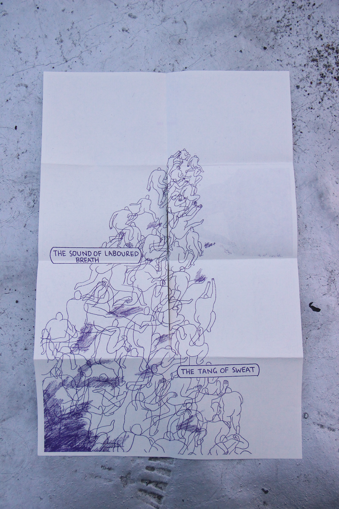 The zine is printed with purple risograph ink on cream paper, and unfolds into a one color 11x17 poster.