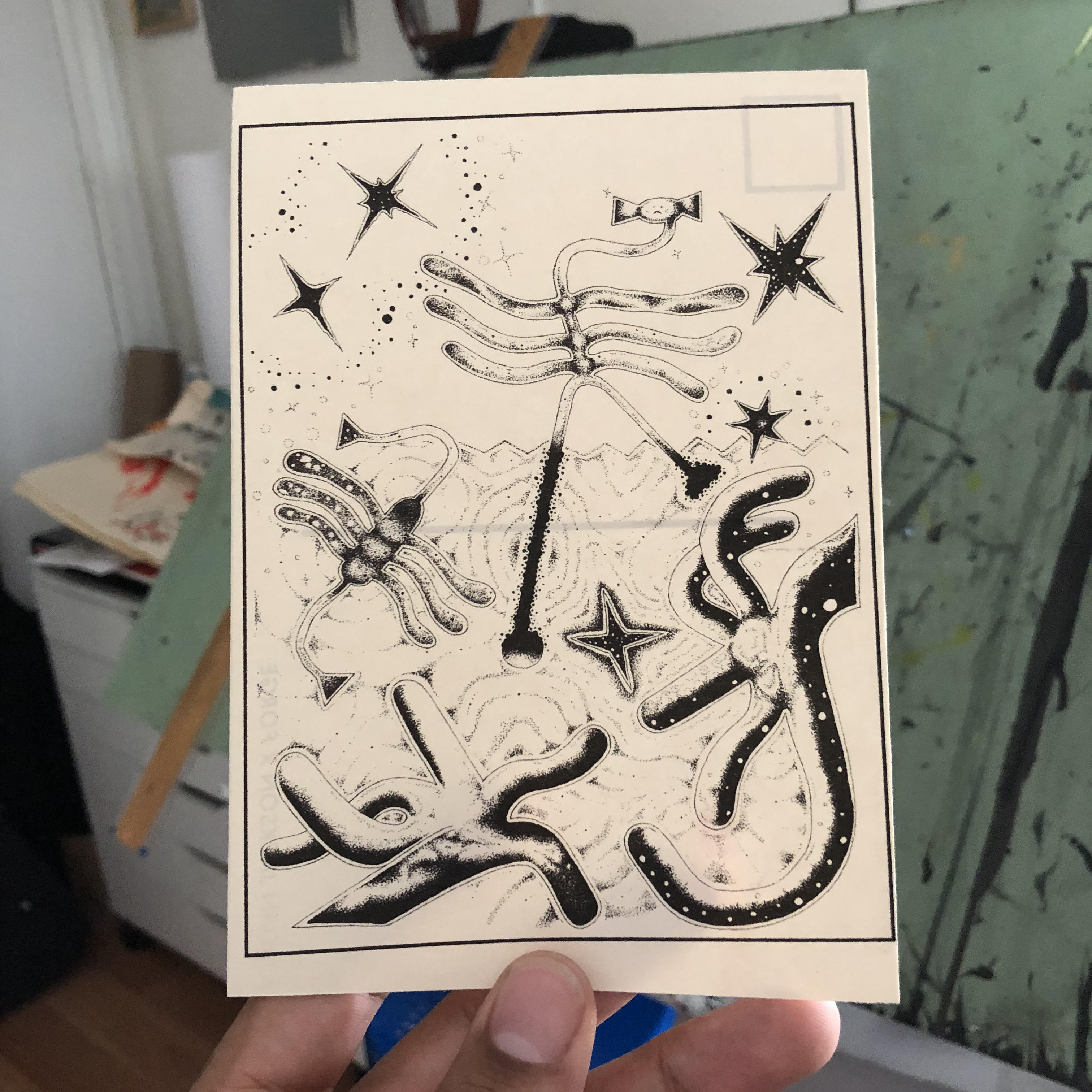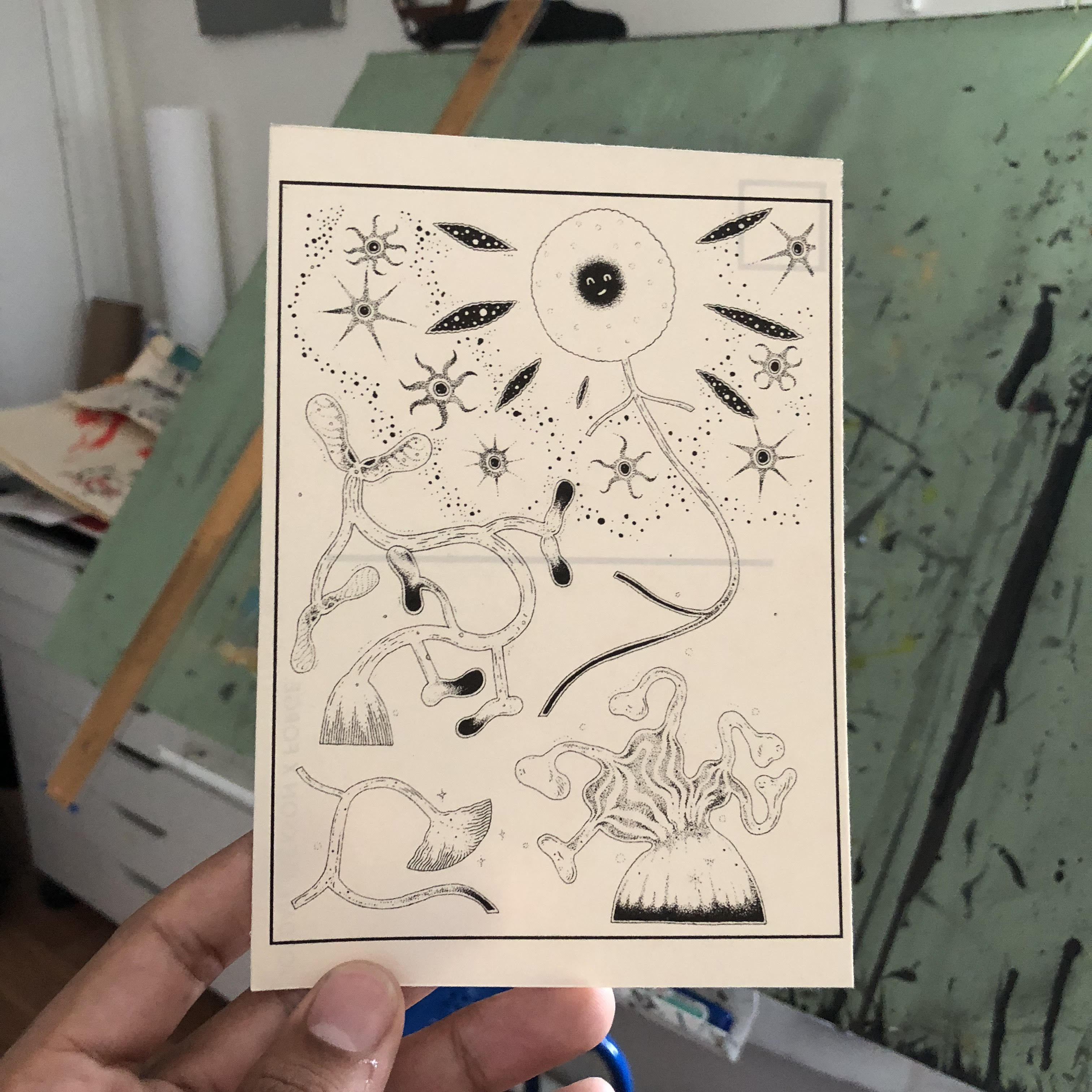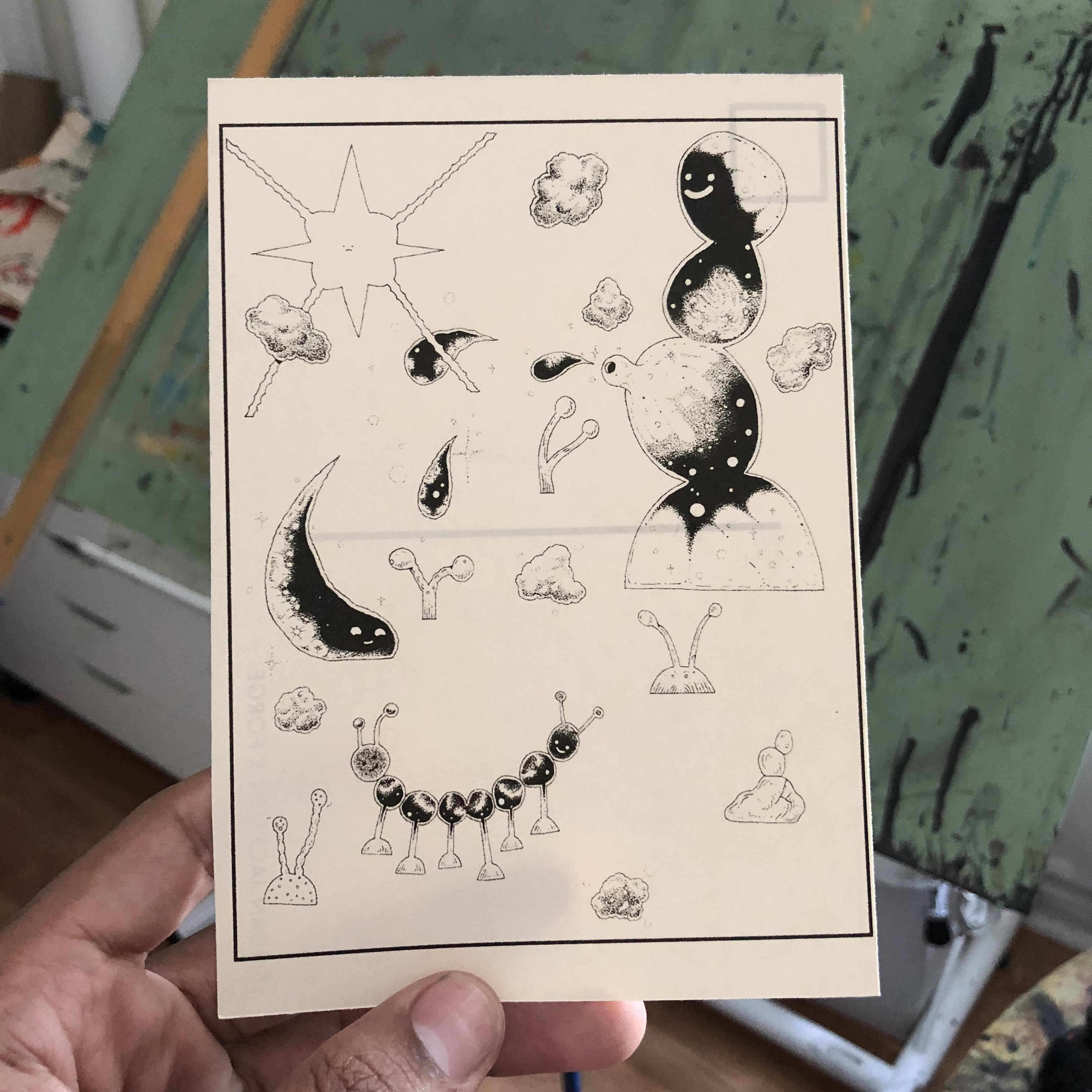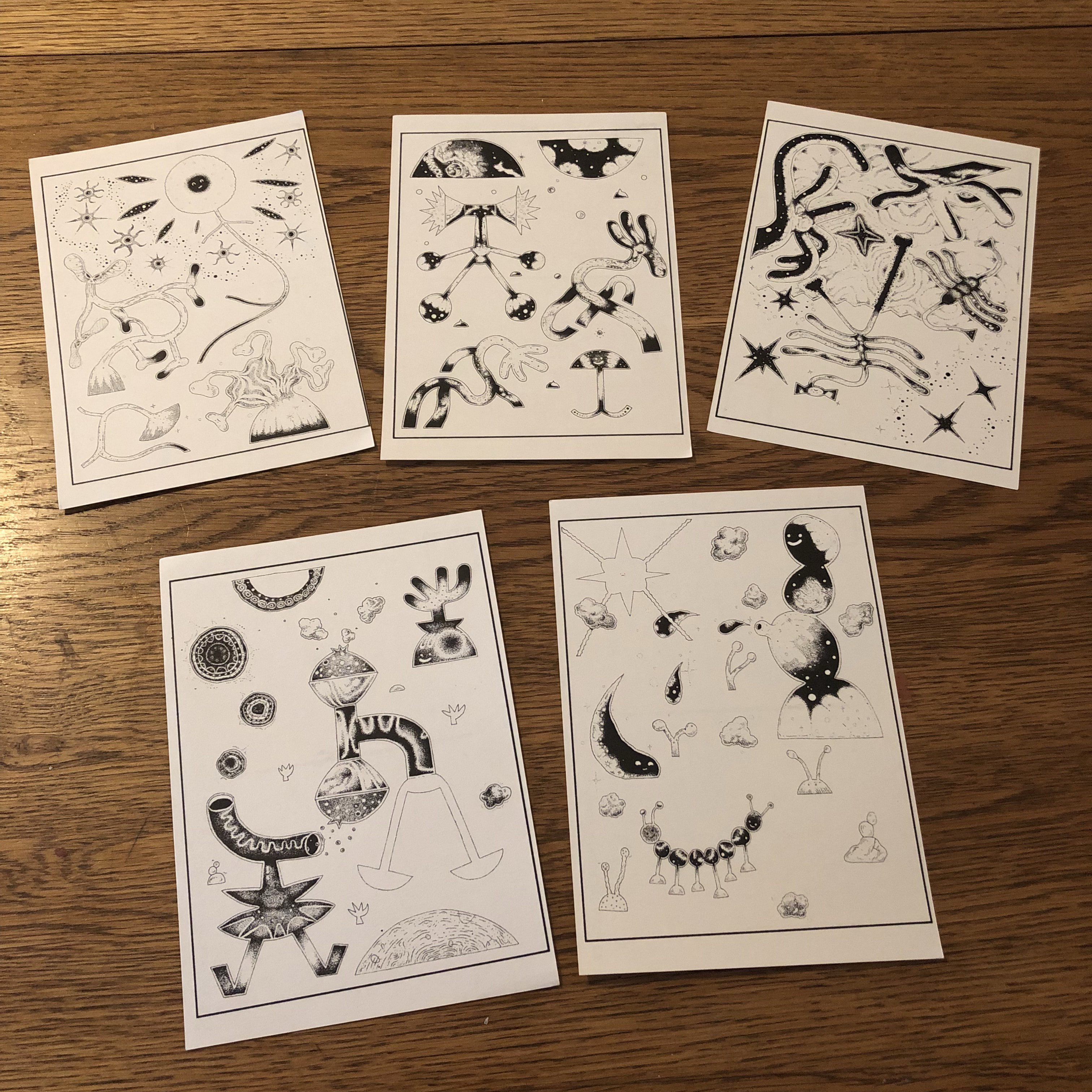 Five postcards illustrated by Jordan Jackson and printed with black riso ink on cream paper.